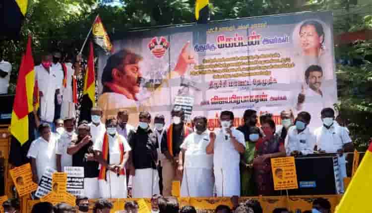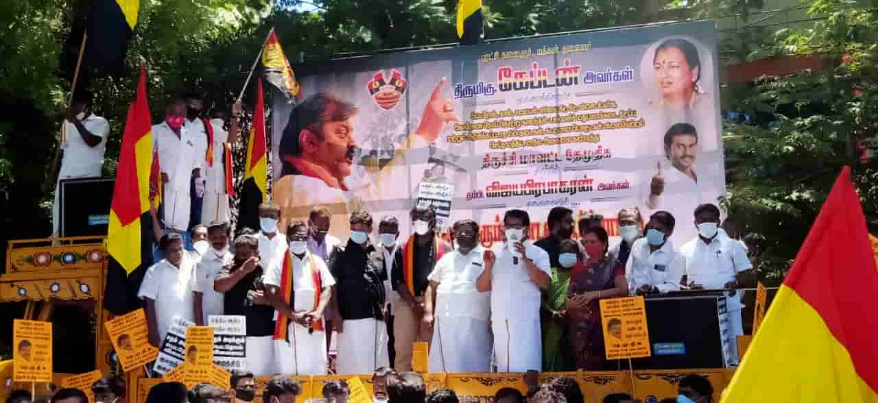 தேமுதிக விஜய் பிரபாகரன் தலைமையில் போராட்டத்தில் நூற்றுக்கும் மேற்பட்ட தேமுதிக தொண்டர்கள் கலந்து கொண்டு போராட்டத்தில் ஈடுபட்டனர்.