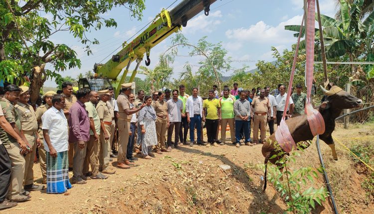 வரவழைக்கப்பட்டு மயக்க ஊசி செலுத்தப்பட்டு ராட்சத கிரேன் மற்றும் பொதுமக்களின் உதவியுடன் கயிற்றின் மூலம் உயிருடன் இருந்த இரண்டு ஆண் காட்டெருமைகளை மீட்டு வனப்பகுதிக்கு ள் பத்திரமாக விரட்டி விட்டனர்.