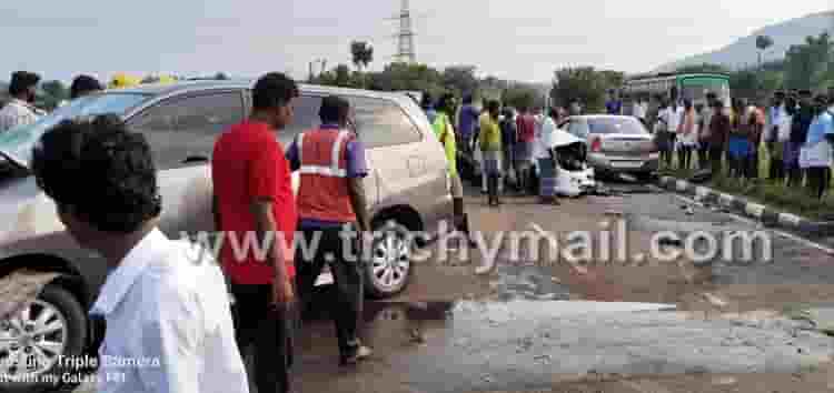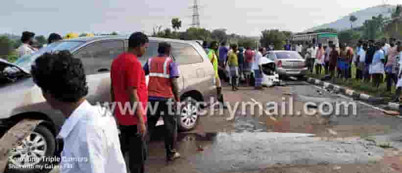 விருதுநகர் மாவட்டம் ராஜபாளையத்தை சேர்ந்தவர் கந்தசாமி வயது 67. இவரது மனைவி மங்கையர்க்கரசி வயது 64. பேரன் பிரதுன் வயது 7, உறவினர்கள் பூஜா வயது 20, ரஞ்சனா வயது 20 ஆகிய ஐந்து பேரும் ஒரு காரில் ராஜபாளையத்திலிருந்து திருச்சி மாவட்டம், நவல்பட்டில் உள்ள மகள் வீட்டுக்கு சென்று கொண்டிருந்தனர். இன்று மாலை மதுரை திருச்சி தேசிய நெடுஞ்சாலையில் திருச்சி மாவட்டம் மணப்பாறை அடுத்த சிவந்தம்பட்டி விளக்கு அருகே கார் சென்று கொண்டிருந்தபோது திடீரென ஓட்டுனரின் கட்டுப்பாட்டை இழந்து சாலை மைய தடுப்பைத் தாண்டி எதிர்சாலைக்கு சென்று எதிரில் வந்த காரில் மீது மோதி விபத்துக்குள்ளானது. இந்த இரண்டு கார்களும் விபத்துக்குள்ளா நிலையில் அந்த கார் மீது பின்னால் வந்த மற்றொரு காரும் மோதி விபத்துக்குள்ளானது. இந்த விபத்தில் மங்கையர்க்கரசி, ரஞ்சனா, பூஜா மற்றும் மற்றொரு காரில் சென்ற பத்மா ஆகிய நான்கு பேர் பரிதாபமாக உயிரிழந்தனர். மேலும் சிலர் படுகாயம் அடைந்து மணப்பாறை அரசு மற்றும் தனியார் மருத்துவமனைகளில் சிகிச்சை பெற்று வருகின்றனர். இந்த விபத்து குறித்து துவரங்குறிச்சி போலீசார் வழக்கு பதிவு செய்து விசாரணை மேற்கொண்டு வரும் நிலையில் இறந்த நான்கு பேரின் உடல்களையும் விட்டு பிரத பரிசோதனைக்காக மணப்பாறை அரசு மருத்துவமனைக்கு அனுப்பி வைத்தனர். இந்த கோர விபத்து அந்த பகுதியில் பெரும் சோகத்தை ஏற்படுத்தி உள்ளது