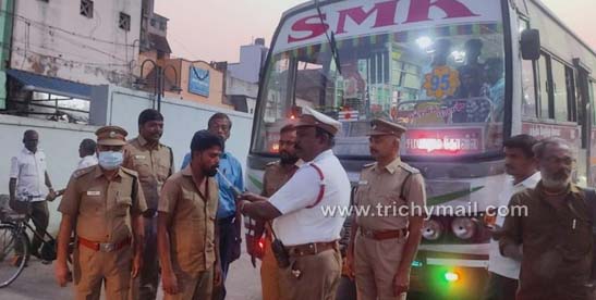 திருச்சி, மார்ச் 16 திருச்சி மாநகரில் இயக்கப்பட்டு வரும் அரசு மற்றும் தனியார் பேருந்து ஓட்டுநர்கள் மதுபோதையில் வாகனங்களை இயக்குவதாக புகார்கள் வந்தன. இதை கண்காணித்து சம்பந்தப்பட்டவர்கள் மீது நடவடிக்கை எடுக்க மாவட்ட மாவட்ட ஆட்சியர் பிரதீப் குமார் உத்தரவிட்டார். அதன்பேரில் சிறீரங்கம் வட்டார போக்குவரத்து அலுவலர் குமார் தலைமையில் மோட்டார் வாகன ஆய்வாளர்கள் பிரபாகரன், அருண்குமார், முகமதுமீரான், செந்தில் மற்றும் போக்குவரத்து காவல்துறையினர் சத்திரம் பேருந்து நிலையம் பகுதியில் சோதனை நடத்தினர். அப்போது பேருந்து ஓட்டுநர்கள் மற்றும் நடத்துநர்களை போதையில் உள்ளதை கண்டறியும் கருவி மூலம் சோதனையிட்டனர். இதில் தனியார் பேருந்து டிரைவர் ஒருவர் மதுபோதையில் பேருந்தை ஓட்டியது தெரியவந்தது. இதையடுத்து அந்த பேருந்து மீது வழக்குப்பதிவு செய்யப்பட்டது. இதில் மொத்தம் 32 அரசு மற்றும் தனியார் பேருந்துகள் சோதனைக்குட்படுத்தப்பட்டன.