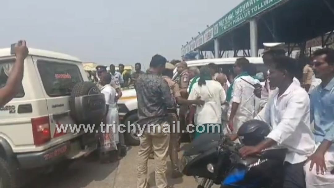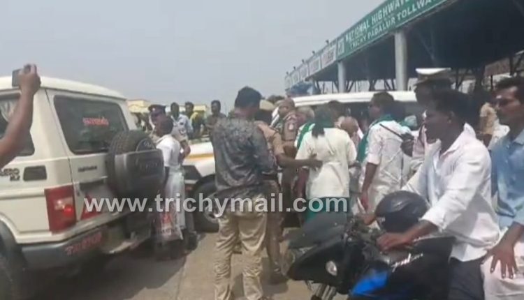 சமயபுரம் சுங்கச்சாவடியில் டெல்லியில் காவல்துறை நடத்திய தடியடியில் உயிரிழந்த விவசாயிக்கு நீதிகேட்டு முற்றுகையிட்டு போராட்டம் நடைபெற்றது.