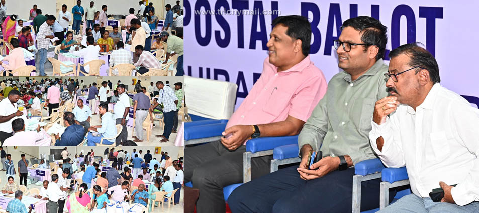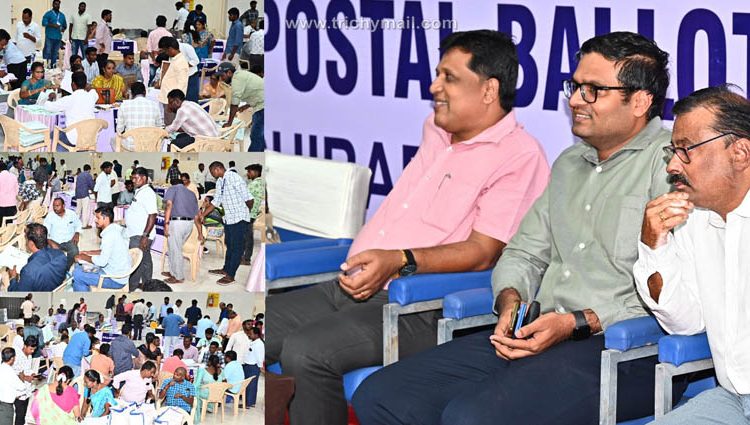 திருச்சி,ஏப்.28 திருச்சி கலையரங்கத்தில் அமைக்கப்பட்டுள்ள சிறப்பு மையத்தில் தமிழ்நாட்டிலுள்ள 38 மாவட்டங்களை சேர்ந்த பதிவு செய்த அஞ்சல் வாக்குகளை அந்தந்த மாவட்டங்களுக்கு பிரித்து வழங்கிடும் பணியினை கூடுதல் தலைமை தேர்தல் அலுவலர் அ.சிவஞானம், திருச்சி மாவட்ட தேர்தல் அலுவலர், மாவட்ட ஆட்சியர் வே.சரவணன் ஆகியோர் நேரில் பார்வையிட்டனர்.