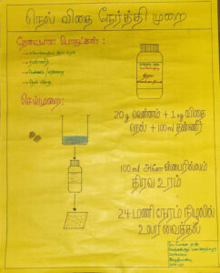கிரமத்தில் தங்கிப் பயிற்சிபெறும் திட்டத்தின் கீழ் பயிற்சி பெறும் நாளந்தா வேளாண் கல்லூரி மாணவர்கள், வேளாண் தொழில்நுட்பம் குறித்துச் செயல் விளக்கம் அளித்து வருகின்றனர். அதன் தொடர்ச்சியாக வே. மோகன் ராஜ் (இறுதியாண்டு மாணவன்), நெல்லில் விதை நேர்த்தி குறித்து விளக்கம் அளித்தார். அவர் கூறியதாவது,