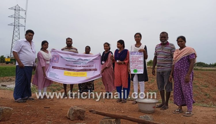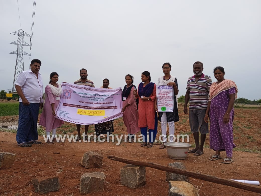 திண்டுக்கல் காந்திகிராம கிராமிய பல்கலைக்கழகத்தை சேர்ந்த இளங்கலை வேளாண்மை இறுதி ஆண்டு மாணவிகள் விசாலினி, விக்னேஷ்வரி, அபிநயா, கயல்விழி, ரேணுகா தேவி ஆகியோர் ஊரக வேளாண் பணி அனுபவ திட்டத்தின் கீழ் மண்ணச்சநல்லூர் பகுதிகளில் பல்வேறு விவசாயம் சார்ந்த நிகழ்ச்சிகளையும், விழிப்புணர்வுகளையும் விவசாயிகள் மற்றும் பொதுமக்களுக்கு ஏற்ப்படுத்தி வருகின்றனர்.