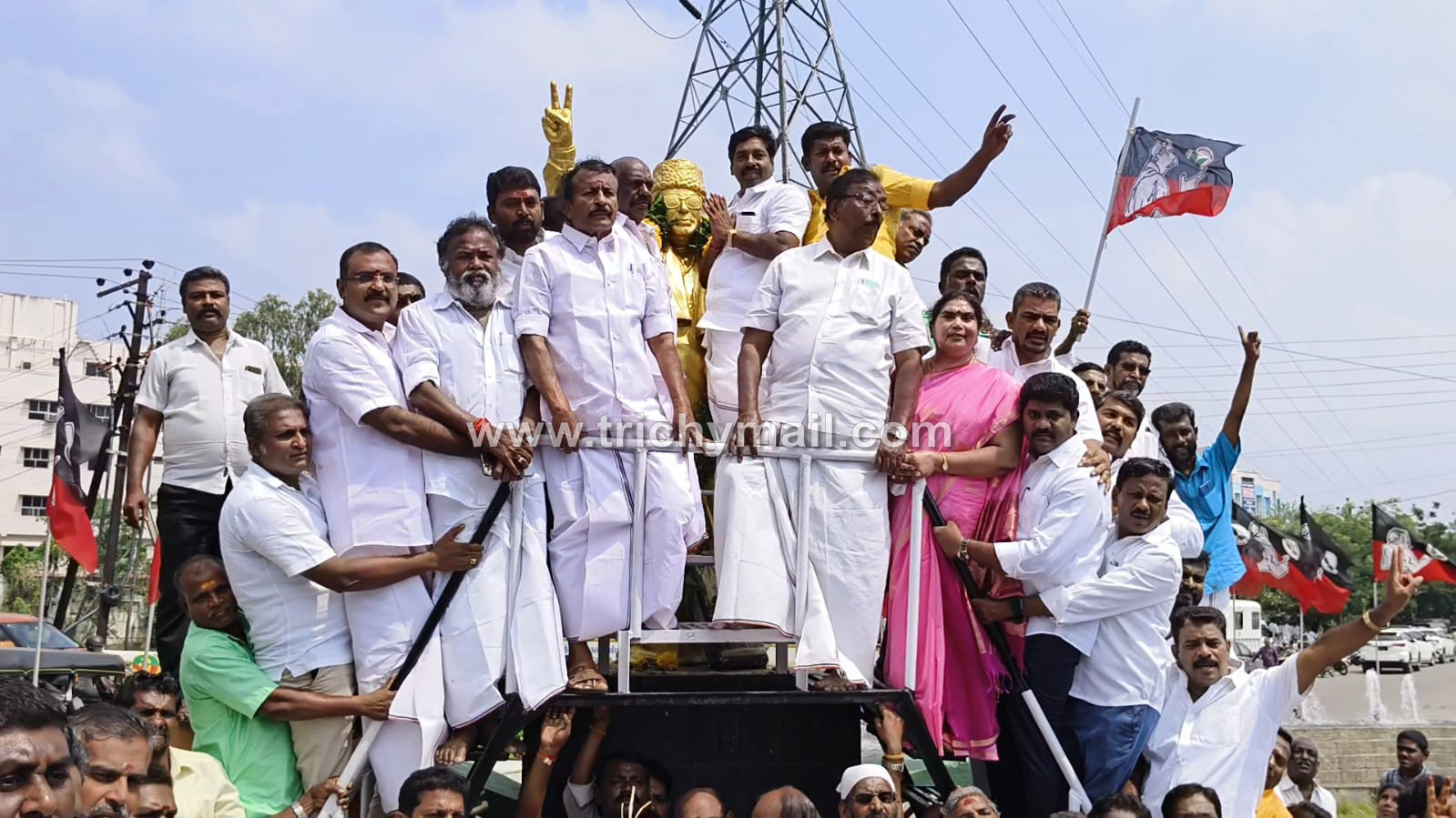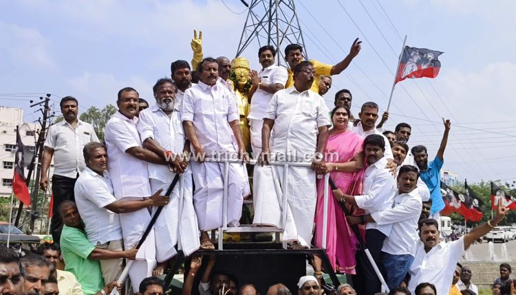 அதிமுக 52 வது தொடக்க விழா நிகழ்ச்சிகள் தமிழகம் முழுவதும் இன்று நடைபெறுகிறது. இதையொட்டி, கட்சிக்கொடி ஏற்றி, ஏழை எளிய மக்களுக்கு நலத்திட்ட உதவிகள், அன்னதானம் உள்ளிட்ட பல்வேறு நிகழ்ச்சிகளுக்கு ஏற்பாடு செய்யப்பட்டுள்ளது. இதன் ஒரு பகுதியாக திருச்சி நீதிமன்றம் அருகே உள்ள எம்ஜிஆர் சிலைக்கு அதிமுக மாநகர கழகம் சார்பில் திருச்சி மாநகர மாவட்ட செயலாளர் சீனிவாசன், முன்னாள் முதலமைச்சர் அதிமுக கழகத்தலைவருமான எம்ஜிஆரின் சிலைக்கு மாலை அணிவித்து மரியாதை செலுத்தினார். தொடர்ந்து முன்னாள் முதலமைச்சர் ஜெயலலிதா திருவுருவ படத்திற்கு மலர் தூவி மரியாதை செலுத்தினார்.