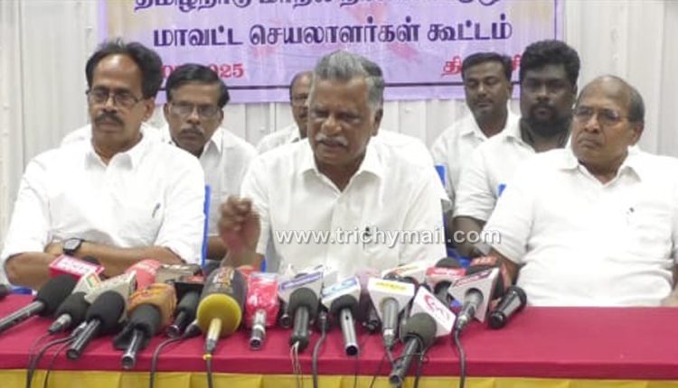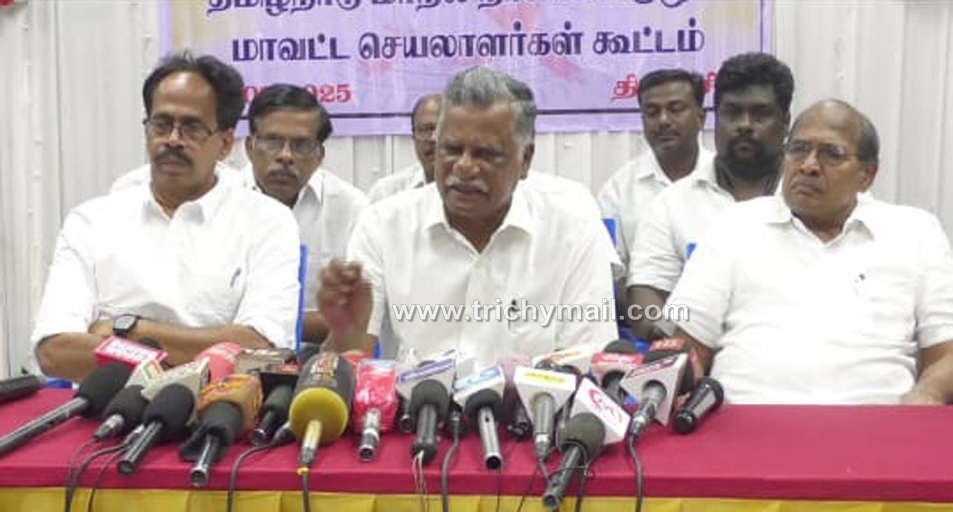 இந்திய கம்யூனிஸ்ட் கட்சியின் மாநில நிர்வாக குழு மற்றும் மாவட்ட செயலாளர்கள் கூட்டம் திருச்சியில் இன்று நடைபெற்றது. கூட்டத்திற்கு முன்னதாக இந்திய கம்யூனிஸ்ட் கட்சியின் மாநில செயலாளர் முத்தரசன் செய்தியாளர்களை சந்தித்து பேசினார். அதில்,