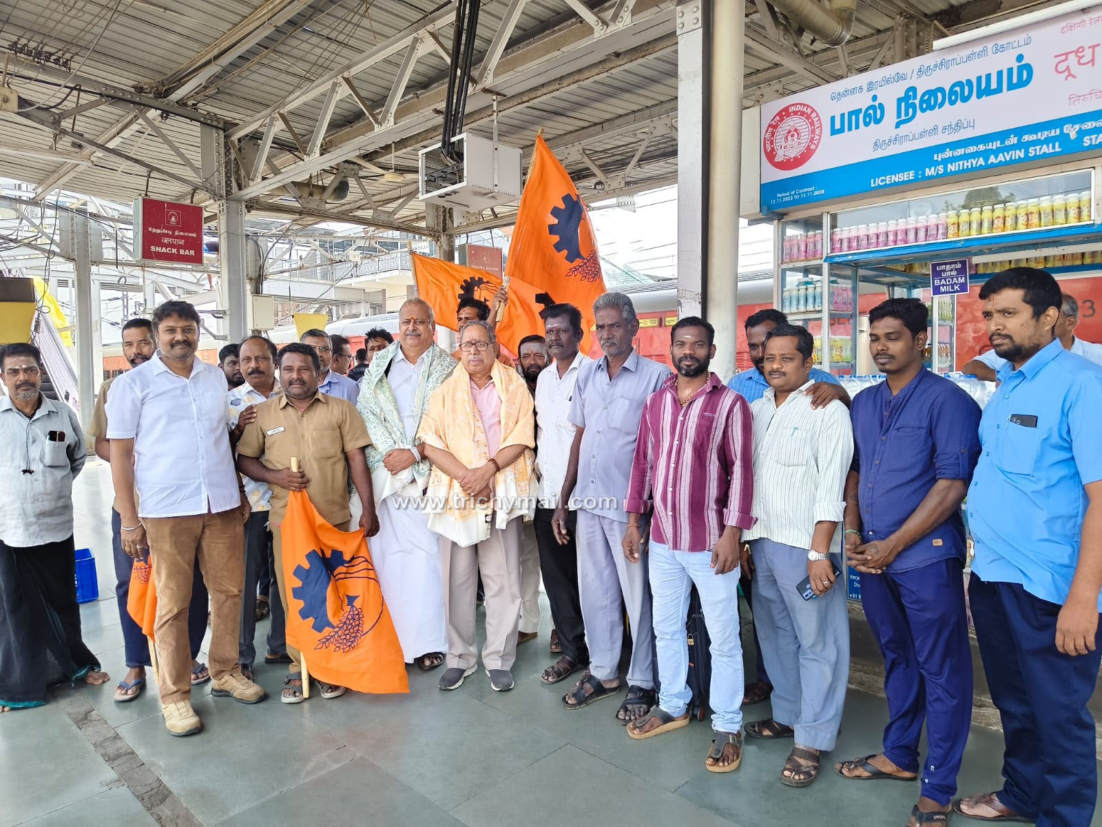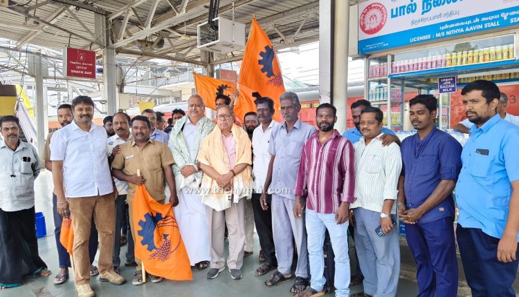 திருச்சி, டிச.20  அகில இந்திய கட்டுமான பேரவை  மாநில செயற்குழுக்கு வருகை தந்த பாரதிய மஸ்தூர் சங்கத்தின் அகில பாரத அமைப்பு செயலாளர் திரு சுரேந்திரன் ஜி மற்றும் தென் பாரத அமைப்பு செயலாளர் துரைராஜ் ஜி அவர்களை டக்சன் ரயில்வே கார்மிக் சங்கத்தின் சார்பில் திருச்சிராப்பள்ளி கோட்ட செயலாளர் சகாய விஜய் ஆனந்த் ஜி, தலைவர் முத்துகுமார் ஜி, துணை தலைவர் சீனிவாசன் ஜி, BMS சார்பில் தமிழ்நாடு மாநில பொதுச் செயலாளர் BMS சங்கர் ஜி, திருச்சி மாவட்ட BMS அமைப்பு செயலாளர் அம்பேத் சாக்ரடீஸ், திருச்சி மாவட்ட ஆட்டோ சங்க தலைவர் ரவி, செயலாளர் S K நாகராஜன்,பொருளாலர் காதர்மொகிதீன் , தொழிலாளர்கள் மற்றும் நிர்வாகிகள் கலந்து கொண்டு வரவேற்றனர்