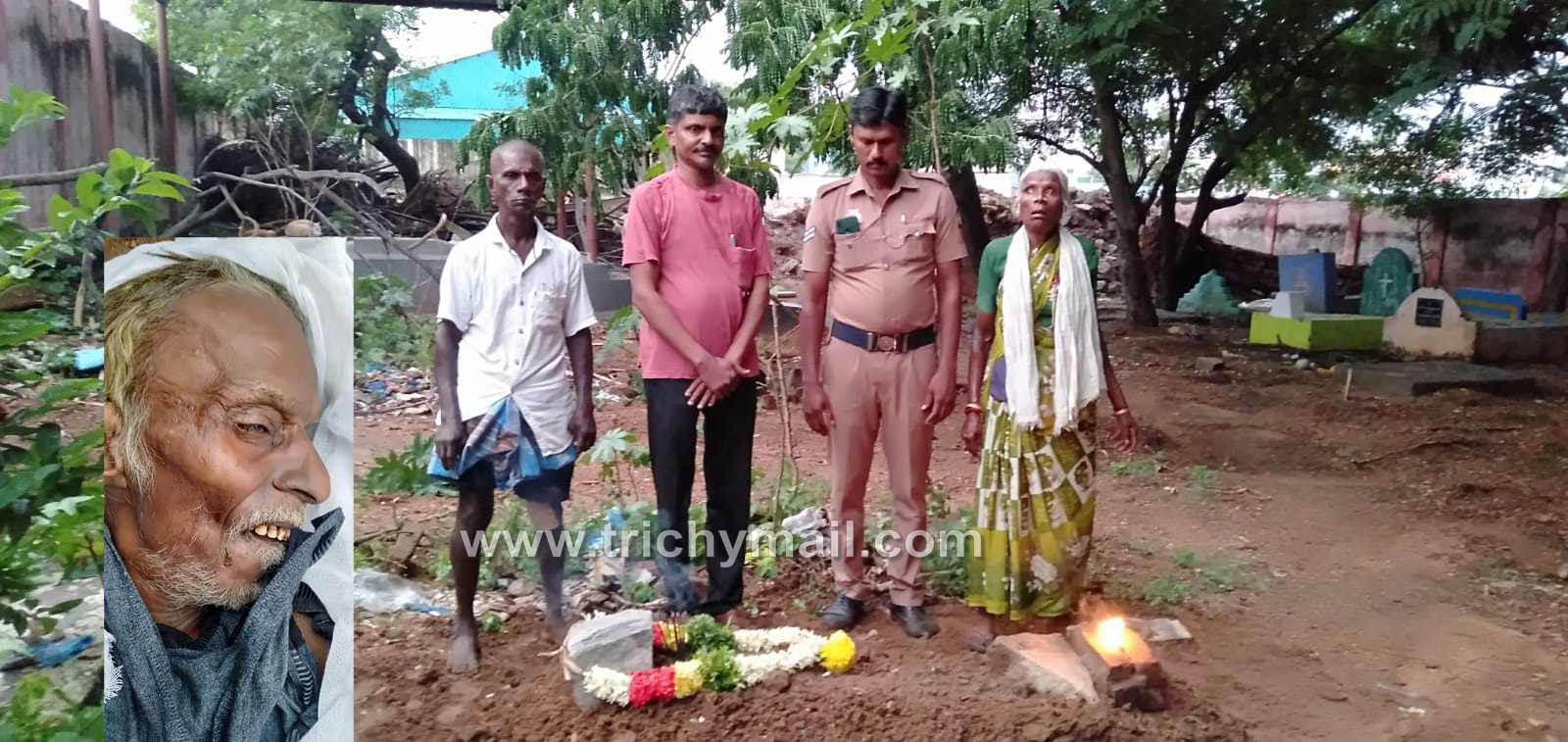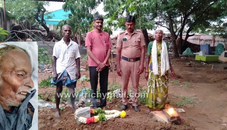 திருச்சி மாநகராட்சி சின்னக்கடை வீதியில் உள்ள கருப்பசாமி கோவில் எதிரில் சுமார் 75 வயது மதிக்கத்தக்க பெயர் விலாசம் தெரியாத முதியவர் மயங்கிய நிலையில் கிடந்தார். பொதுமக்கள் உதவியுடன் திருச்சி மாநகர் கோட்டை காவல் நிலைய சட்ட ஒழுங்கு காவலர்கள் 108 ஆம்புலன்ஸ் மூலமாக திருச்சிராப்பள்ளி மகாத்மா காந்தி நினைவு அரசு மருத்துவமனையில் உள் நோயாளியாக சேர்க்கப்பட்டார். அன்றைய தினமே சிகிச்சை பலனின்றி இறந்தார். மேற்கண்ட நபர் குறித்து சம்பவ இடத்தில் விசாரிக்கையில் இறந்த நபர் குடும்பம் ஏதும் இல்லாமல் அதே பகுதியில் பல ஆண்டுகளாக அனாதையாக பிச்சை எடுத்து சாப்பிட்டு பூட்டிய கடைகள் மற்றும் தெருவோரங்களில் படுத்துக்கொண்டு அனாதையாக வாழ்ந்து வந்ததாக தெரிவித்தனர் இறந்தவருக்கு எந்த ஒரு உறவினர்களும் இல்லை என்றும் அவர் பல ஆண்டுகளாக அதே பகுதியில் அனாதையாக பிச்சை எடுத்து சாப்பிட்டுக் கொண்டு பூட்டிய கடைகள் மற்றும் தெருவோரங்கள் படுத்துக் கொண்டு வாழ்ந்தவர் என்றும் விசாரணையில் தெரிய வந்தது. மேற்கண்ட நபர் இறப்பில் எந்தவித சந்தேகமும் இல்லை என்பதாலும் அந்நபரின் பிரேதத்தை நல்லடக்கம் செய்ய கோட்டை காவல் நிலைய காவலர் வினோத் அமிர்தம் சமூக சேவை அறக்கட்டளை நிர்வாக அறங்காவலர் யோகா ஆசிரியர் விஜயகுமார்க்கு கோட்டை காவல் நிலைய காவலர் வினோத் அளித்த தகவலின் அடிப்படையில் அவரின்