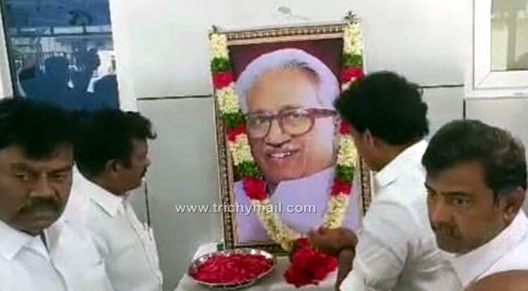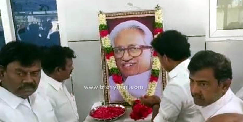 திருச்சி தெற்கு மாவட்டத்தில், இனமான பேராசிரியர் மறைந்த  க.அன்பழகனின்   மூன்றாம் ஆண்டு நினைவு நாளை முன்னிட்டு, மாவட்ட கழக அலுவலகத்தில், மாவட்ட கழக செயலாளரும், பள்ளி கல்வித்துறை அமைச்சருமான அன்பில் மகேஸ்  தலைமையில் இனமான பேராசிரியர் க.அன்பழகன் திருவுருவ படத்திற்கு மாலை அணிவித்து மரியாதையை செலுத்தப்பட்டது .