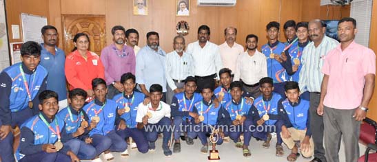திருச்சி, ஜன.12 திருச்சி மாவட்ட ஆட்சியரகத்தில் 63 ஆவது குடியரசு தின விழாவையொட்டி தர்மபுரியில் கடந்த 6 ஆம் தேதி முதல் 8 ஆம் தேதி வரை நடைபெற்ற 17 வயதிற்குட்பட்டவர்களுக்கான மாநில அளவிலான கால்பந்து போட்டியில் திருச்சி விளையாட்டு விடுதியில் தங்கி காஜாமியான் பள்ளியில் பயிலும் மாணவர்கள் முதலிடம் பெற்றதையொட்டி பதக்கம் மற்றும் சான்றிதழை மாவட்ட ஆட்சியர் பிரதீப்குமாரிடம் காண்பித்து வாழ்த்து பெற்றனர். இந்நிகழ்வில் மாவட்ட விளையாட்டு அலுவலர் ராஜேந்திரன், விடுதி மேலாளர் சுகந்தி, பயிற்றுநர் குணசேகரன் மற்றும் பள்ளி நிர்வாகிககள், தலைமையாசிரியர்கள் உள்ளனர்.