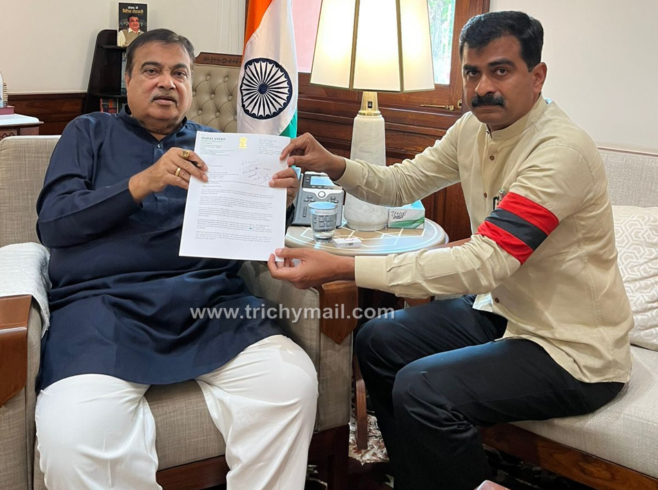 திருச்சி, ஆக.8  திருச்சி நாடாளுமன்ற உறுப்பினர் துரை வைகோ, திருச்சி தஞ்சாவூர் தேசிய நெடுஞ்சாலை அமைந்துள்ள NH-67 பால்பண்ணை–துவாக்குடி பகுதியில் அணுகு சாலை (Service Road) அமைக்க வேண்டும் என்ற 16 ஆண்டு கோரிக்கையை நிறைவேற்றித்தந்திட, ஒன்றிய அரசின் மத்திய நிதி பகிர்மானத்திலிருந்து ஒதுக்கீடு செய்துதர வேண்டி எனது கோரிக்கை கடிதத்துடன் ஒன்றிய போக்குவரத்து மற்றும் நெடுஞ்சாலைத்துறை அமைச்சர் நித்தின் ஜெயராம் கட்கரி-யை அவரது அலுவலகத்தில் இன்று சந்தித்தார்.