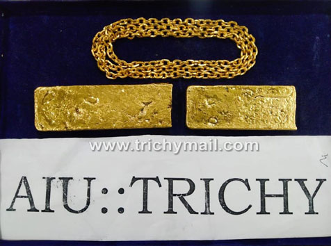 திருச்சி விமான நிலையத்திற்கு ஷார்ஜாவில் இருந்து வந்த ஏர் இந்தியா எக்ஸ்பிரஸ் விமானத்தில் பயணம் செய்த பயணிகளை விமான நிலைய வான் நுண்ணறிவு பிரிவு சுங்கத்துறை அதிகாரிகள் சோதனை செய்த போது அதில் பயணம் செய்த 2 ஆண் பயணிகளில் ஒருவர் தனது பேண்டில் மறைத்து வைத்து எடுத்து வந்த தங்க சங்கிலி மற்றும் உடலில் ஆசனவாயில் மறைத்து எடுத்து வந்த ரூ. 1 கோடியே 13 லட்சத்து 28 ஆயிரத்து 880 மதிப்புள்ள 1 கிலோ 840 கிராம் எடையுள்ள தங்கத்தை பறிமுதல் செய்து சுங்கத்துறை அதிகாரிகள் அவர்களிடம் விசாரணை நடத்தி வருகின்றனர்.