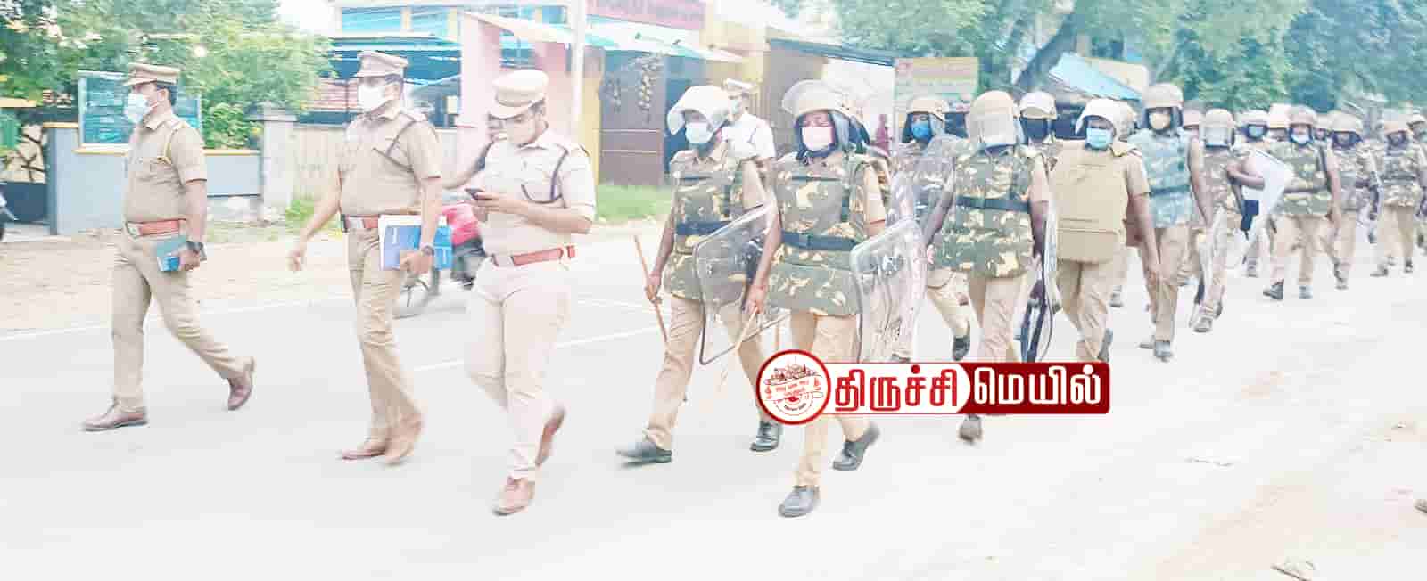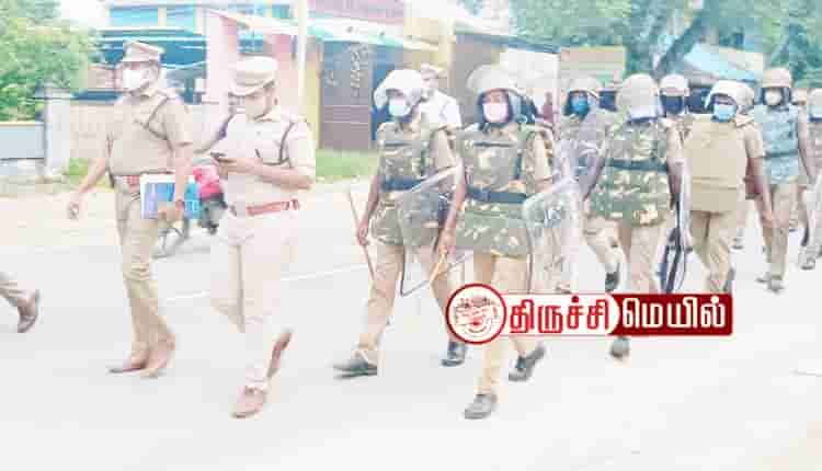 திருச்சி மாவட்டம், முசிறி அருகே கொளக்குடி உள்ளிட்ட பகுதிகளில் சட்டம், ஒழுங்கு பாதிப்பு ஏற்படுத்தும் பிரச்சினைகள் நடைபெற்றதால் பொதுமக்கள் அச்சமின்றி இருக்கவும், சட்டம்-ஒழுங்கு குறித்த விழிப்புணர்வை பொதுமக்கள் மத்தியில் ஏற்படுத்தும் வகையில் போலீஸ் டி.எஸ்.பி அருள்மணி, பயிற்சி டி.எஸ்.பி. விக்னேஷ்வரன், இன்ஸ்பெக்டர்கள், சப்-இன்ஸ்பெக்டர்கள் மற்றும் பாதுகாப்புபடை போலீசார் முசிறி கைகாட்டியில் இருந்து நகரின் முக்கிய வீதிகளில் அணிவகுப்பு ஊர்வலமாக சென்றனர். அப்போது போலீசாரின் வஜ்ரா வாகனமும் சென்றது. போலீசாரின் இந்த பாதுகாப்பு அணிவகுப்பு ஊர்வலத்தை பொதுமக்கள் ஆர்வத்துடன் பார்த்தனர்.