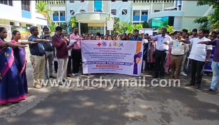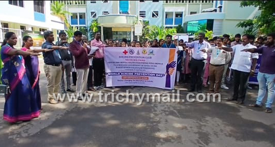 உலக தற்கொலை தடுப்பு தினத்தை முன்னிட்டு திருச்சி பிஷப் ஹீபர் கல்லூரியின் தற்கொலை தடுப்பு சங்கம், செஞ்சிலுவை சங்கம், செஞ்சிலுவை மனநல நல்வாழ்வு மையம் மற்றும் முதுகலை ஆராய்ச்சி மற்றும் சமூக பணித்துறை இணைந்து தற்கொலை தடுப்பு தின விழிப்புணர்வு பேரணியை இன்று நடத்தியது. இப்பேரணியை தாசில்தார் பிரகாஷ் கொடியசைத்து தொடங்கி வைத்தார் வருவாய்த்துறை ஆய்வாளர் கார்த்திகேயன் மற்றும் மக்கள் தொடர்பு அலுவலர் பாலசுப்பிரமணியன் ஆகியோர் முன்னிலை வகித்தனர்.