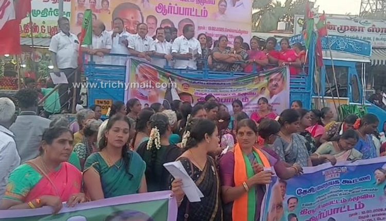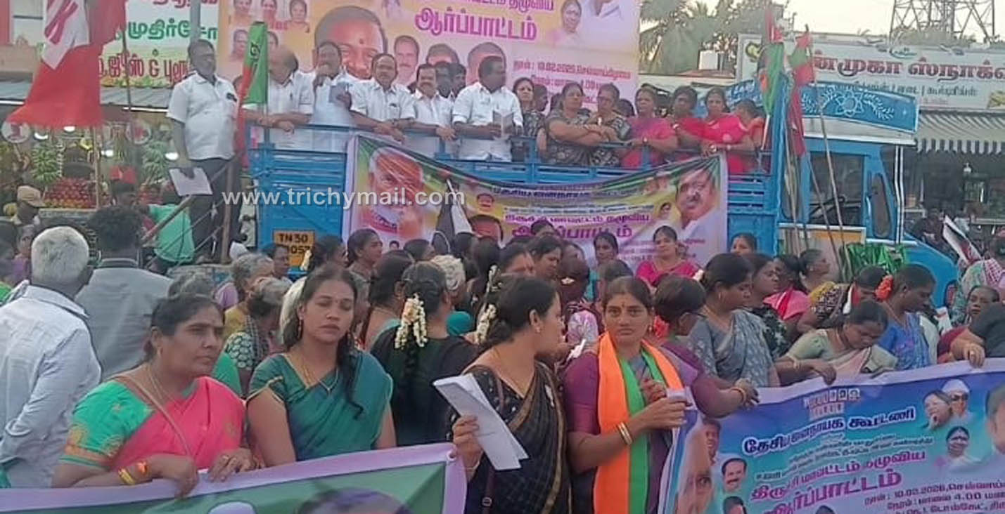 திருச்சி, பிப். 11  தமிழகத்தில் பெண்களின் பாதுகாப்பை உறுதி செய்யத்தவறிய திமுக அரசை கண்டித்து பாஜக மற்றும் கூட்டணி கட்சிகள் சார்பில் நம்பர் ஒன் டோல்கேட்டில் கண்டன ஆர்ப்பாட்டம் நடைபெற்றது.