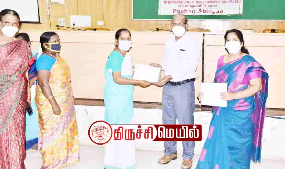 திருச்சி கலெக்டர் அலுவலகத்தில் ஒருங்கிணைந்த குழந்தை வளர்ச்சி திட்டத்தின் சார்பில் போஷான் அபியான் திட்டத்தை கிராம அளவில் சிறப்பாக செயல்படுத்திய அங்கன்வாடிப் பணியாளர்கள், உதவியாளர்கள், மேற்பார்வையாளர்கள், கிராம சுகாதார செவிலியர்கள்,