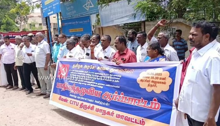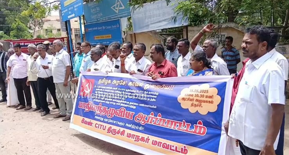திருச்சி மாவட்ட ஆட்சியர் அலுவலகம் அருகே திருச்சி மாவட்டம் சி ஐ டி யு சார்பாக சென்னை மாநகராட்சி அலுவலகம் முன்பு 13 நாட்கள் தொடர் போராட்டம் நடத்திய தூய்மை பணியாளர்கள் மீது காவல்துறை எடுத்த நடவடிக்கையை கண்டித்தும் தேர்தல் வாக்குறுதிகளை நிறைவேற்றாத திமுக அரசை கண்டித்து திருச்சி மாவட்டம் சி ஐ டி யு தலைவர் சீனிவாசன் தலைமையில் கண்டன ஆர்ப்பாட்டம் நடைபெற்றது. இதில் தூய்மை பணியாளர்கள் தங்களுடைய கோரிக்கைகளை வலியுறுத்தி தொடர்ந்து போராட்டம் நடத்தியும் இதுவரை திமுக அரசு எந்த நடவடிக்கையும் எடுக்கவில்லை என கோசங்கள் எழுப்பப்பட்டது. மேலும் தமிழ்நாடு முழுவதும் உள்ள தூய்மை பணியாளர்களை பணி நிரந்தரம் செய்திட வேண்டும் என வலியுறுத்தப்பட்டது.
