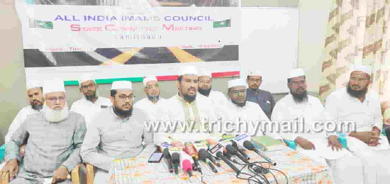 திருச்சியில் ஆல் இந்தியா இமாம்ஸ் கவுன்சில் சார்பாக மாநில செயற்குழு கூட்டம் மாநில தலைவர் ஆபிருத்தீன் மன்பஈ தலைமையில் நடைபெற்றது. மாநில பொதுச்செயலாளர் அர்சத் அல்தாபி, மாநில துணைத்தலைவர்கள் அப்துல் ராஜிக் பாகவி, சம்சுல் இக்பால், மாநில செயலாளர்கள் பாதுஷா