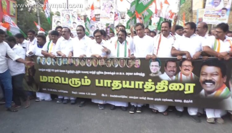 மகாத்மா காந்தி 100 நாள் வேலை வாய்ப்பு திட்டத்தை ஒழிக்க நினைக்கும் பாஜக அரசை கண்டித்து மாபெரும் அமைதி ஊர்வலம் திருச்சியில் காங்கிரஸ் சார்பில் பேரணி நடைபெற்றது