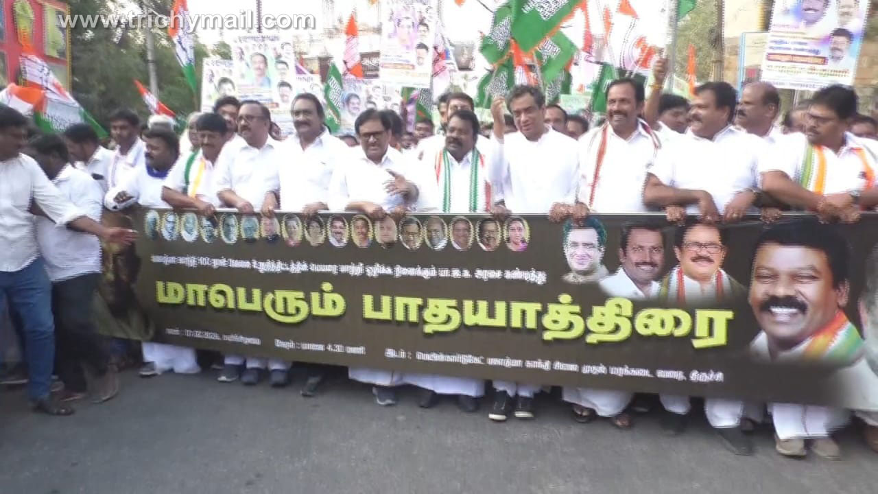 இந்த நடைப்பயணத்தில் தமிழக காங்கிரஸ் கட்சி தலைவர் செல்வப் பெருந்தகை முன்னாள் தமிழ்நாடு காங்கிரஸ் கட்சி தலைவர் திருநாவுக்கரசு. மற்றும் சட்டமன்ற காங்கிரஸ் கட்சி தலைவர் எஸ் ராஜேஷ்குமார் . அகில இந்திய காங்கிரஸ் தமிழக பொறுப்பாளர் கிரீஸ் சோடாங்கர். அகில இந்திய காங்கிரஸ் செயலாளர்கள் எம் என் சூரஜ் . நிவேதிக் அல்வா ஆகியோர் பங்கேற்றனர் மேலும திருச்சி மாவட்டத் தலைவர் ரெக்ஸ் வடக்கு மாவட்ட தலைவர் தொட்டியம் ஈ எம் சரவணன். தெற்கு மாவட்ட தலைவர் ராஜலிங்கம் ஆகியோர் உடன் இருந்தனர். இந்த அமைதி பேரணியில் 2000க்கும் மேற்பட்ட காங்கிரஸ் கட்சியினர் கலந்து கொண்டனர். பின்னர் மரக்கடை பகுதியில் மாபெரும் பாதயாத்திரை விளக்கப் பொதுக்கூட்டம் நடைபெற்றது