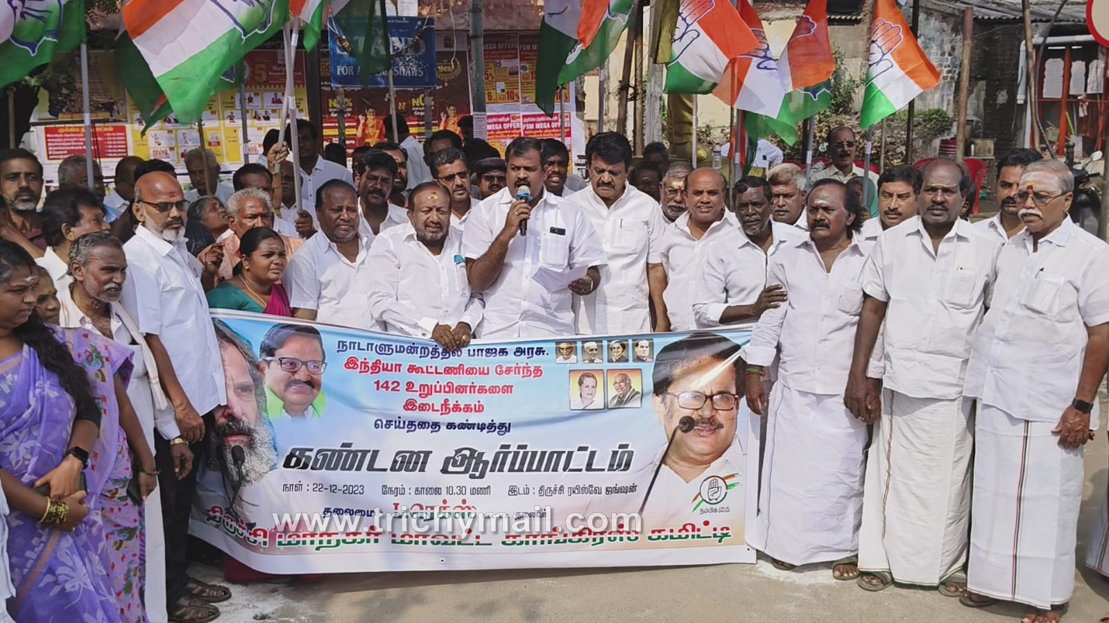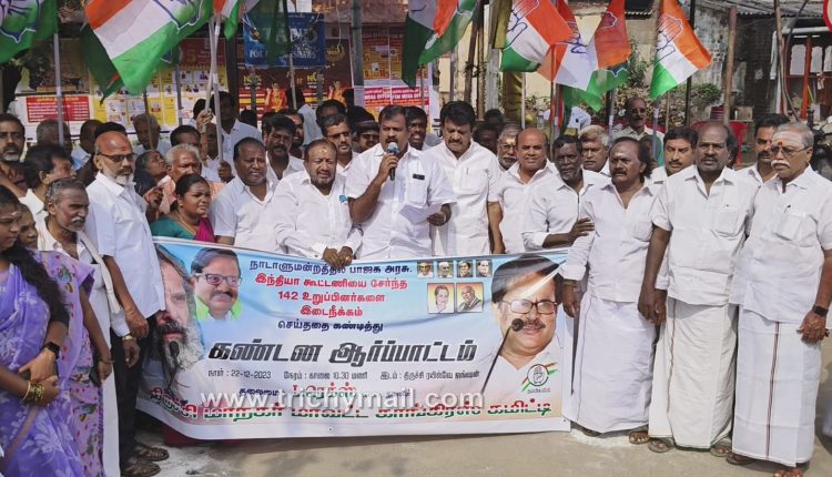 திருச்சி, டிச. 22 நாடாளுமன்றத்தில் இந்தியா கூட்டணியை சேர்ந்த காங்கிரஸ் உள்ளிட்ட 146 உறுப்பினர்களை இடைநீக்கம் செய்ததை கண்டித்து திருச்சி வடக்கு மாவட்ட காங்கிரஸ் கட்சியின் தலைவர் கலை தலைமையில் ஜங்ஷன் ரயில் நிலையம் எதிரில் உள்ள ராஜீவ் காந்தி சிலை அருகில் கண்டன ஆர்ப்பாட்டம் இன்று நடைபெற்றது