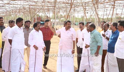 வாக்குச்சாவடி பொறுப்பாளர்கள் பயிற்சி கூட்டத்திற்கு பந்தல் அமைக்கும் பணி : அமைச்சர் கே.என்.நேரு ஆய்வு