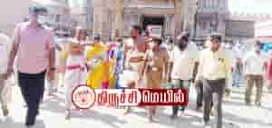 முன்னதாக, திருச்சி- சென்னை தேசிய நெடுஞ்சாலையில் சமயபுரம் அருகே உள்ள இருங்களூர் கைகாட்டியில் இருந்து காரிலிருந்து இறங்கி சுமார் ஐந்து கிலோமீட்டர் தூரம் பாதயாத்திரையாக நடந்து மாரியம்மன் கோவிலுக்கு இரவு 7.20 மணிக்கு வந்தார்.