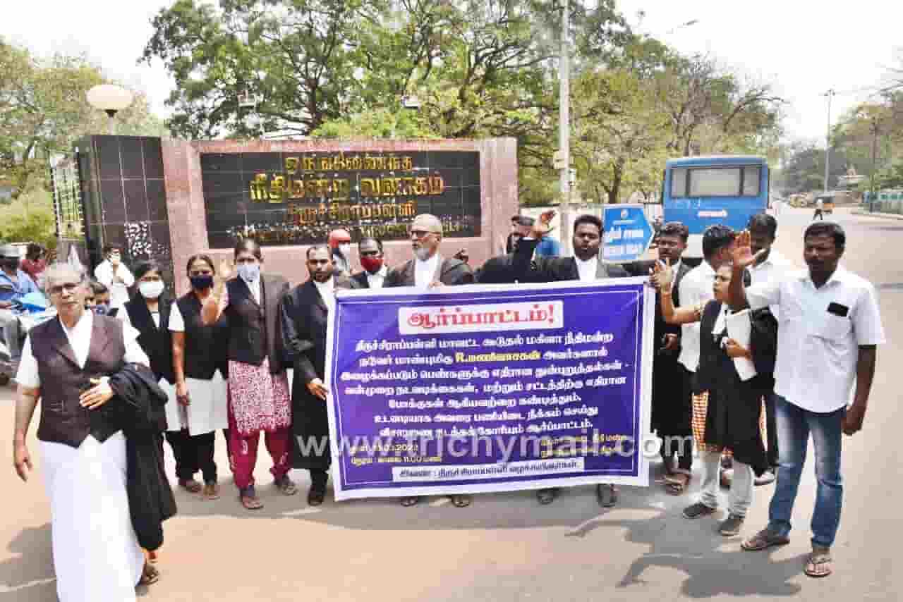 திருச்சி மாவட்ட நீதிமன்ற நுழைவுவாயில் முன்பு இன்று காலை வக்கீல்கள் ஆர்ப்பாட்டத்தில் ஈடுபட்டனர். ஆர்ப்பாட்டத்திற்கு த.பானுமதி, ஜோ.கென்னடி ஆகியோர் தலைமை தாங்கினர்.