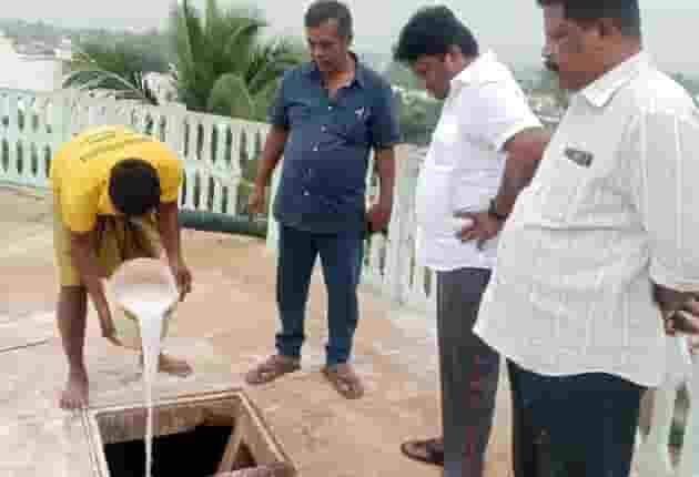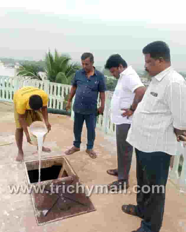 தொட்டியம் பேரூராட்சிக்குட்பட்ட பகுதியில் வசிக்கும் பொது மக்களுக்கு கிருமி நாசினி மருந்து கலக்கப்பட்ட குடிநீர் வினியோகம் செய்ய வருவதற்காக கிருமி நாசினி மருந்து மேல்நிலை நீர்த்தேக்க தொட்டியில் கலக்கப்பட்டது.