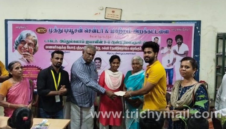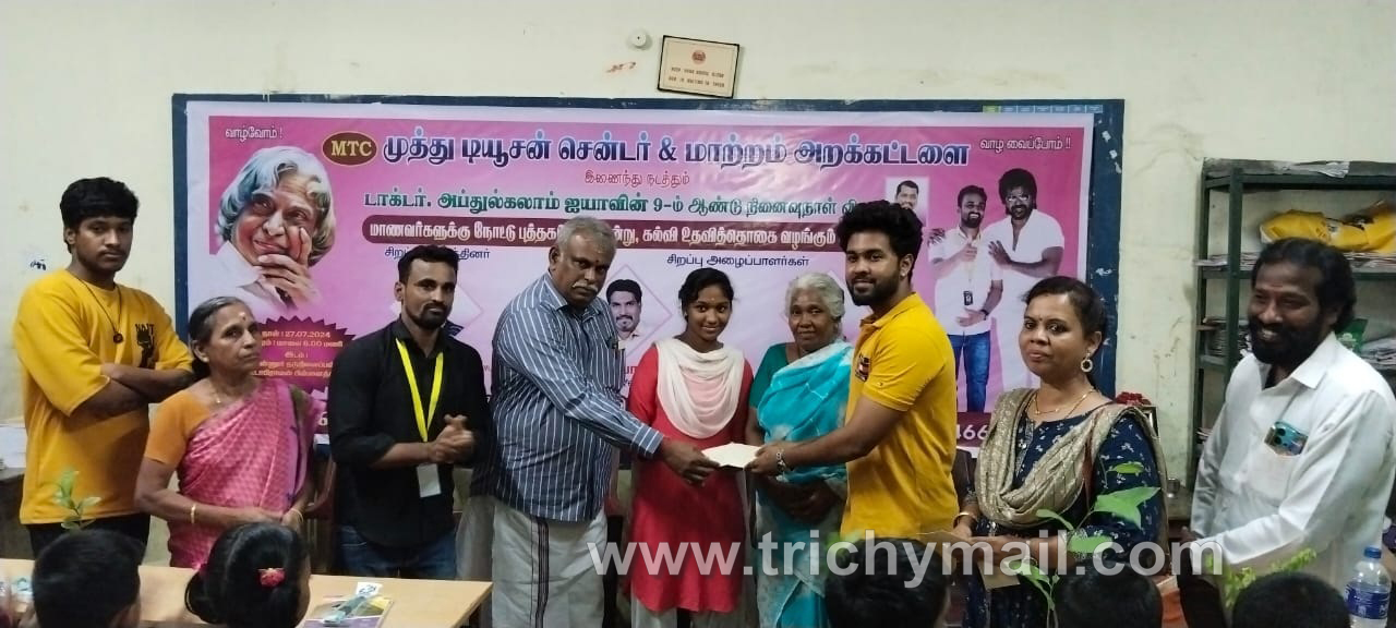 டாக்டர் அப்துல் கலாம் அவர்களின் 9 ஆம் ஆண்டு நினைவு நாளை முன்னிட்டு திருச்சியில் உள்ள MTC முத்து டியூஷன் சென்டர் மற்றும் மாற்றம் அறக்கட்டளை இணைந்து மாணவர்களுக்கு நோட்டு புத்தகம் மரக்கன்று கல்வி உதவித்தொகை வழங்கும் விழா நடைபெற்றது ..இந்த நிகழ்வில் சிறப்பு விருந்தினராக அரசு வழக்கறிஞர் R.பாஸ்கரன்‌ மற்றும் சிறப்பு அழைப்பாளர்களாக லட்சுமி ஜுவல்லர்ஸ் OTS.N.பாலாஜி, Mister Interior மிதுன் ஆகியோர் கலந்து கொண்டு மாணவ, மாணவிகளுக்கு நோட்டு புத்தகம், மரக்கன்றுகள், கல்வி உதவித் தொகை வழங்கி சிறப்பித்தனர்.இந்த விழாவை MTC முத்து டியூஷன் சென்டர் இயக்குநர் கலாம் M.செல்வகுமார் ஏற்பாடு செய்து இருந்தார்‌