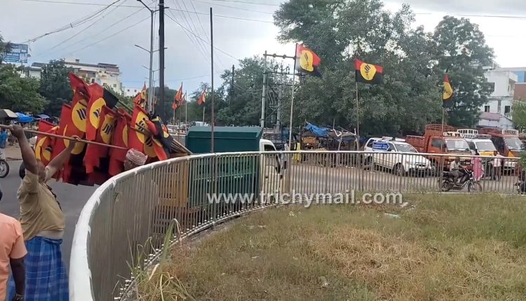 திருச்சி, ஜூலை 26 திருச்சி மாவட்டம், மணப்பாறையில் தேமுதிக சார்பில் மின் கட்டண உயர்வு, ரேஷன் கடையில் பொருட்கள் தட்டுப்பாடு மற்றும் தமிழ்நாட்டிற்கு உரிய காவிரி நீரை வழங்க மறுக்கும் கர்நாடக அரசை கண்டித்தும் மணப்பாறை பேருந்து நிலையம் முன்பாக ஆர்ப்பாட்டம் நடைபெற்றது. இதற்காக சாலைகளில் உள்ள தடுப்பு சுவரில் தேமுதிக கட்சி கொடிக்கம்பங்கள் வைத்திருந்தனர். ஆடிக் காற்றின் வேகம் காரணமாக தேமுதிக கொடிக்கம்பங்கள் சாலையில் விழுந்தது. இதனால் சாலையில் சென்ற பொதுமக்கள் மற்றும் வாகன ஓட்டிகள் அச்சத்தில் செல்லும் நிலை ஏற்பட்டது.