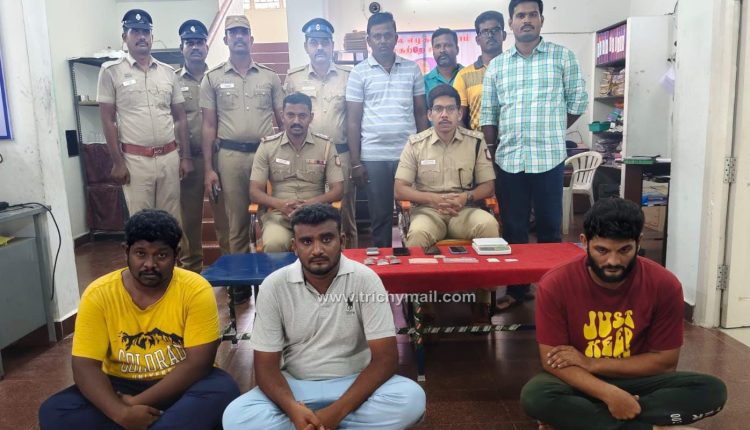 திருச்சி, ஏப். 24  திருச்சிமாவட்டம், திருவெறும்பூர் காவல் நிலைய எல்லைக்குட்பட்ட காட்டூர் பகுதிகளில் உள்ள கல்லூரி மற்றும் பள்ளிகள் அருகே அரசால் தடை செய்யப்பட்ட போதைப் பொருள்கள் விற்பனை செய்யப்படுவதாக  கிடைத்த ரகசிய தகவலின் அடிப்படையில் மாவட்ட காவல் கண்காணிப்பாளர்  உத்தரவின் பேரில் திருவெறும்பூர் காவல் உதவி கண்காணிப்பாளர் மேற்பார்வையில் காவல் ஆய்வாளர், மற்றும் தனிப்படையினர் செவ்வாய்க்கிழமை மாலை காட்டூர் பகுதியில் தேடுதல் வேட்டை நடத்திய போது அப்பகுதியில் போலீசாரை கண்டதும் மூன்று நபர்கள் தப்பித்து ஓட முயன்ற போது அவர்களை காவல்துறையினர் விரட்டி மடக்கி பிடித்தனர்.