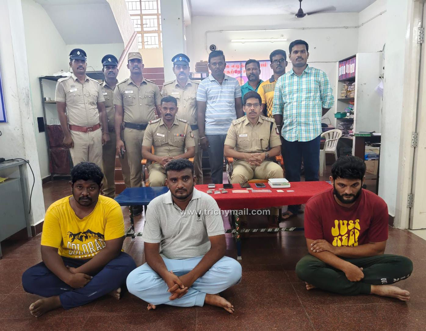 மேற்படி மூன்று நபர்களும்  தீரன் நகர், ரெங்கா சுரேந்திரன் (வயது 33), உய்யகொண்டன்மலை ராமர் @ ராகேஷ் (31),  தில்லை நகர் ஸ்ரீ ஹரிஷ்குமார் (30) என்பதும், மேலும், அவர்களை விசாரித்த போது முன்னுக்கு பின் முரணாக பதிலளித்தின் பேரில் அவர்களை சோதனை செய்த போது அவர்களிடமிருந்து ரூ. 2,00,000/- மதிப்புள்ள போதை பொருட்களான மெத்தகுலோன், MDMA போதை மாத்திரைகள், செறிவூட்டப்பட்ட கஞ்சா, எடை இயந்திரம், ஐ போன்-2 மற்றும் ஆண்ட்ராய்டு போன்-1 ஆகியவற்றை கைப்பற்றி, மூவர் மீதும் திருவெறும்பூர் காவல் நிலைய குற்ற எண். 292/2025 ச.பி. 8 (c), r/w 20 (b) (ii) (A), 22 (b), 22 (c), 23 (b), 27 (a) NDPS Act-ன்படி வழக்கு பதிவு செய்து நீதிமன்ற காவலுக்கு அனுப்பப்பட்டனர்.