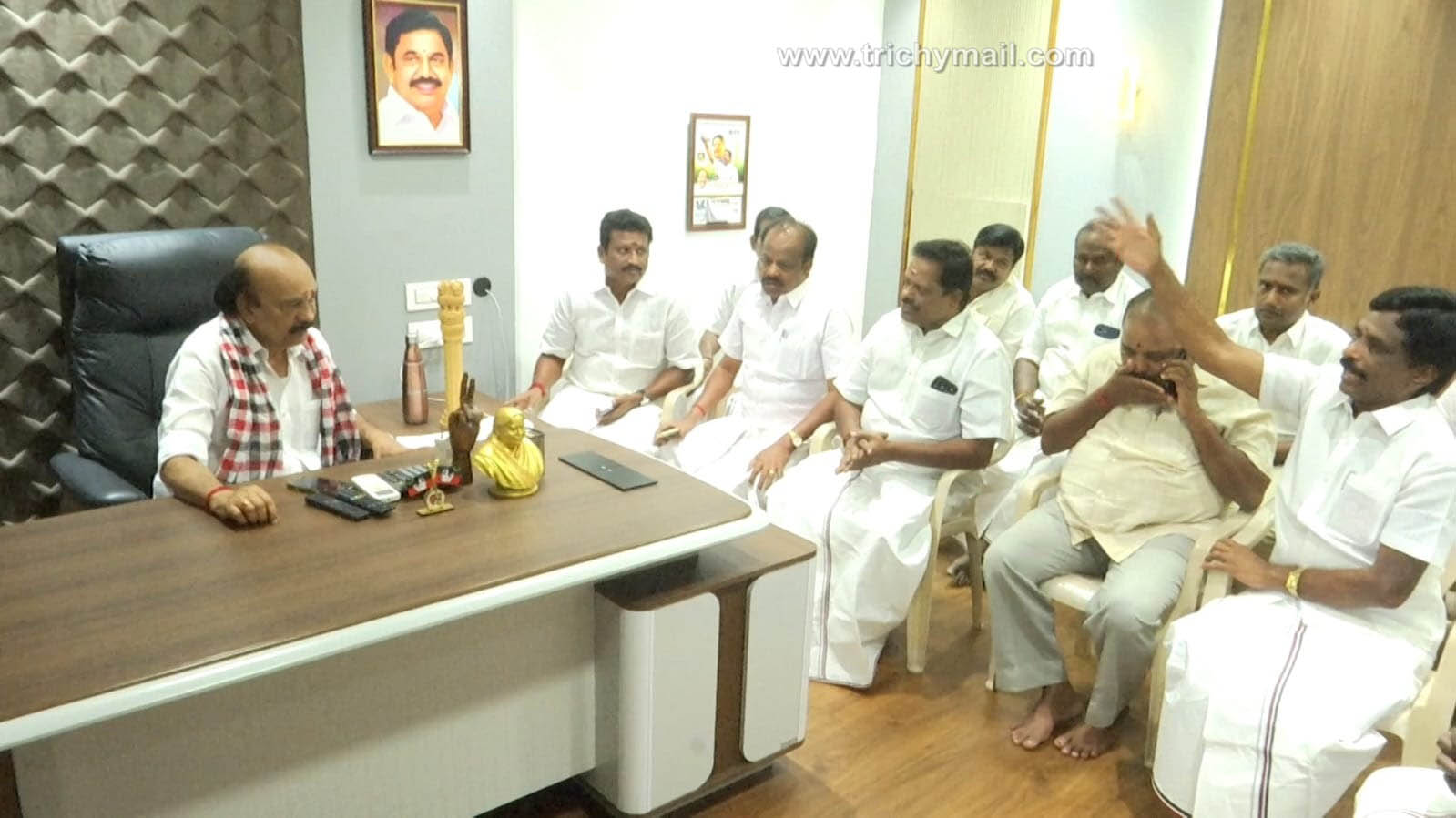 திருச்சி, மார்ச் 28 திருச்சி மாவட்டம் ஸ்ரீரங்கம் சட்டமன்ற தொகுதி வேட்பாளராக கழக அமைப்புச் செயலாளர் முன்னாள் அரசு தலைமை கொறடா ஆர் மனோகரன் அறிவிக்கப்பட்டார்.இந்நிலையில் இன்று திருவானைக்காவில் உள்ள அவரது அலுவலகத்தில் அதிமுகவை சேர்ந்த ஒன்றிய நகர பகுதி பேரூர் கழக நிர்வாகிகள் உடன் தேர்தல் பணிகள் குறித்து ஆலோசனையில் ஈடுபட்டார்.
