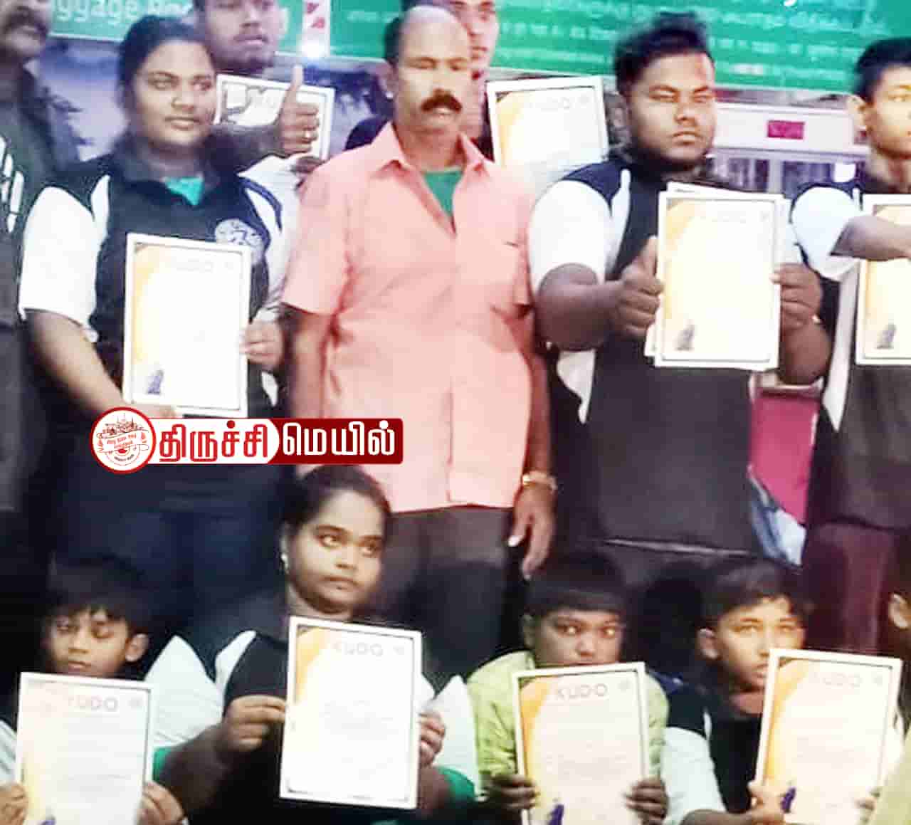 இந்நிலையில் பதக்கம் பெற்று ரெயில் மூலம் திருச்சி திரும்பிய வீரர்-வீராங்கனைகளுக்கு ரெயில் நிலையத்தில் வரவேற்பு அளிக்கப்பட்டது. இவர்களை வழிநடத்தி சென்ற மாஸ்டர் கந்தமூர்த்திக்கு போட்டியின்போது 5-ம் நிலை கருப்பு பட்டை மற்றும் ரென்சிபட்டம் வழங்கப்பட்டது.