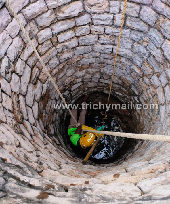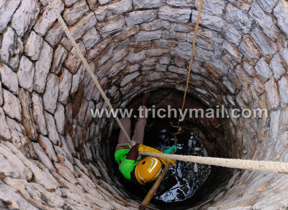 கல்லக்குடியில் 30 அடி ஆழ கிணற்றில் தவறி விழுந்த நாய். தீயணைப்பு வீரர்கள் உயிருடன் மீட்டனர்.