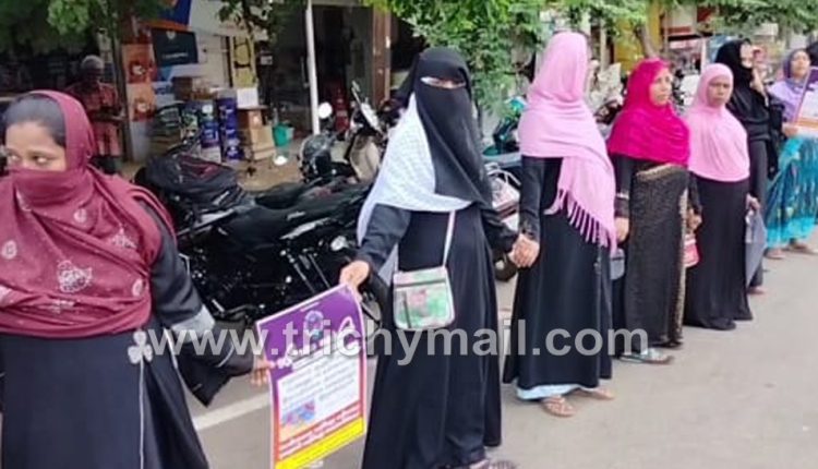 திருச்சியில் நடைபெற்ற மனித சங்கிலி விழிப்புணர்வு நிகழ்ச்சியில்சிறப்பு விருந்தினர்களாக .என். ஆர்.ஐ ஏ எஸ்.அகாடமியின் இயக்குனர் விஜயா லயன் ஆகியோர் கலந்து கொண்டு சிறப்பித்தனர், இதில் தலைமை தபால் நிலையம் முதல் மேலப்புதூர் வரை மனித சங்கிலி நிகழ்ச்சி நடைபெற்றது. இந்நிகழ்வில் ஜமாஅத்தே இஸ்லாமி ஹிந்து மகளிர் அணியைச்சேர்ந்த நிர்வாகிகள் தொண்டர்கள் உட்பட சமூக ஆர்வலர்கள்உள்ளிட்டவர்கள் ஏராளமான பங்கேற்றனர். நிகழ்ச்சியின் முடிவில் மக்கள் தொடர்புச் செயலாளர் நவாஸ்கான் நன்றி கூறினார்