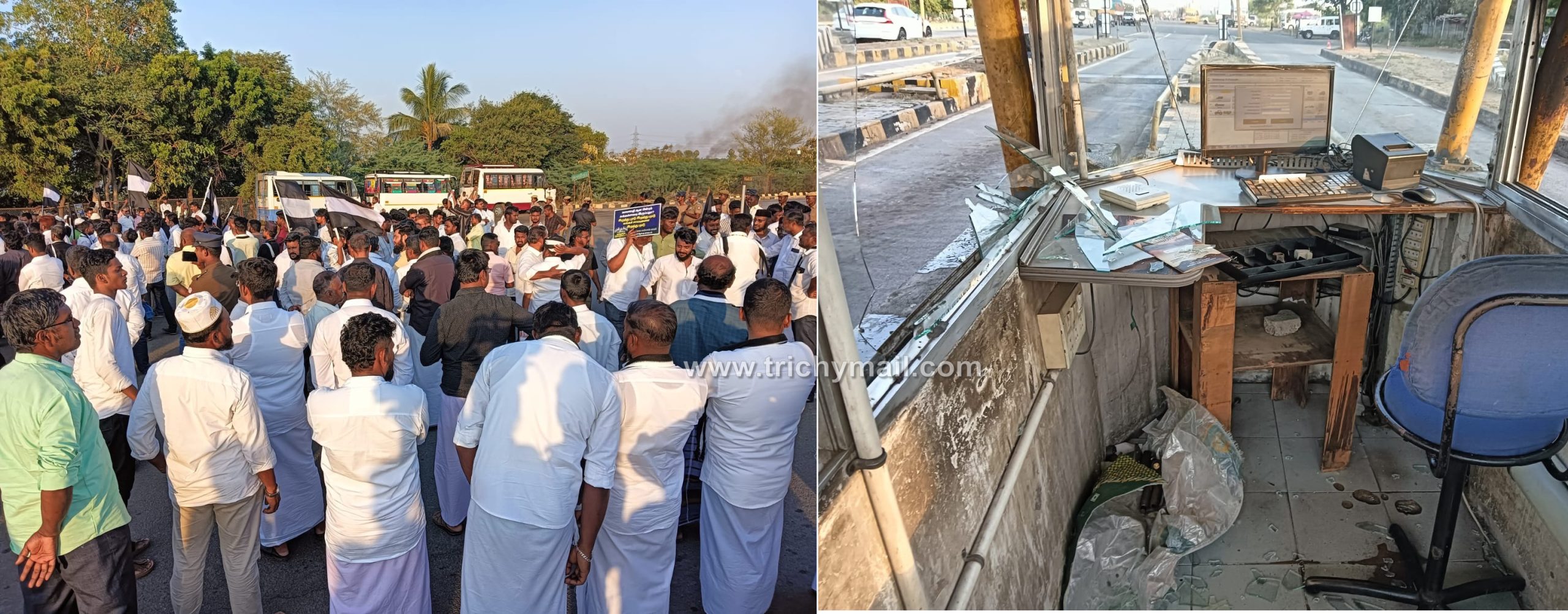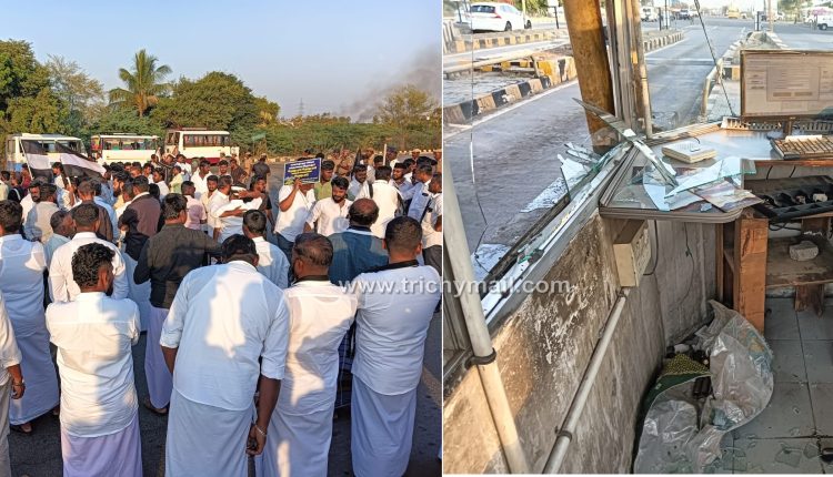 அதில் ஒரு பகுதியாக திருச்சி தஞ்சை தேசிய நெடுஞ்சாலையில் திருவெறும்பூர் அருகே துவாக்குடி பகுதியில் உள்ள சுங்கச்சாவடியை மாவட்ட மனிதநேய மக்கள் கட்சியின் மாவட்ட செயலாளரும் மணப்பாறை எம்எல்ஏ னமான அப்துல் சமது தலைமையில் மனிதநேய மக்கள் கட்சியினர் முற்றுகையிட்டு போராட்டத்தில் ஈடுபட்டனர்.