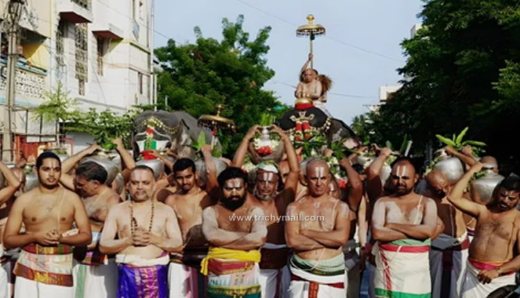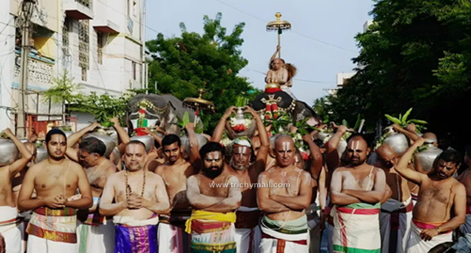 திருச்சி ஸ்ரீரங்கம் ரங்கநாதர் கோயிலில் ஆண்டுதோறும் ஆனி மாதம் ஜேஷ்டாபிஷேகம் எனப்படும் பெரிய திருமஞ்சனம் நடைபெறும். இந்த ஆண்டு கடந்த 21 ஆம் தேதி தொடங்கி 2 நாட்கள் மூலவர் ரங்கநாதர், உற்சவர் நம்பெருமாளுக்கு ஜேஷ்டாபிஷேகம் நடைபெற்றது. இதைத்தொடர்ந்து கோயிலில் உள்ள ரங்கநாச்சியார் தாயாருக்கு ஜேஷ்டாபிஷேகம் நேற்று (28ஆம் தேதி) நடந்தது. இதையொட்டி இன்று காலை வட காவிரியான கொள்ளிடம் ஆற்றில் இருந்து தங்க குடத்தில் புனித நீரை யானை ஆண்டாள் மீது வைத்தும், திருமஞ்சன ஊழியர்கள், சீமான் தாங்கிகள் வெள்ளி குடங்களில் தோளில் சுமந்தும் கோயிலுக்கு எடுத்து வந்தனர். கோயிலின் ரங்க விலாச மண்டபத்தில் வைத்து புனித நீர் மேள தாளங்கள் முழங்க தாயார் சன்னதிக்கு எடுத்து செல்லப்பட்டு திருமஞ்சனம் நடைபெற்றது.