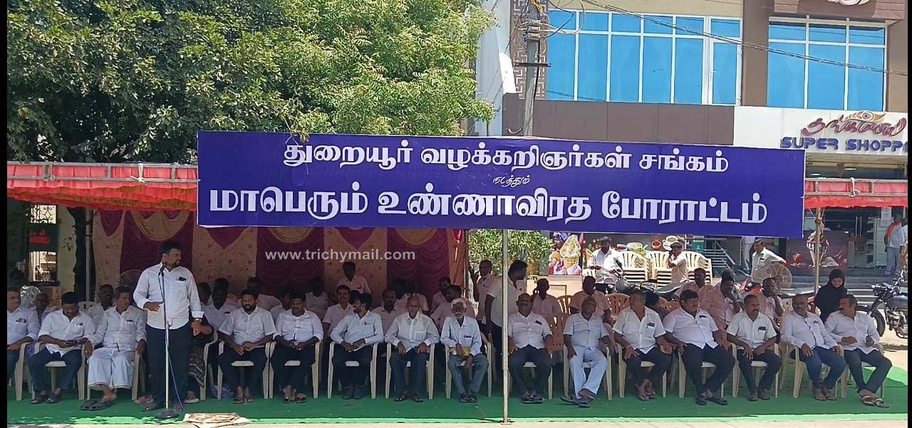 திருச்சி மாவட்டம் துறையூர் நீதிமன்றத்தில் சுமார் 100 வழக்கறிஞர்கள் செயல்பட்டு வருகின்றனர் தற்போது முசிறி பகுதியில் தனியாக புதிய நீதிமன்றம் கட்டுப்பட்டு செயல்பட்டு வருகிறது. ஜம்புநாதபுரம் காவல் நிலையத்திற்கு உட்பட்ட குற்ற வழக்குகள் அனைத்தும் துறையூர் நீதிமன்றத்தில் வாதாடப்பட்டு வந்தது தற்போது முசிறியில் நீதிமன்றம் செயல்பட தொடங்கியதை தொடர்ந்து ஜம்புநாதபுரம் காவல் நிலையத்துக்கு உட்பட்ட வழக்குகள் அனைத்தும் துறையூர் நீதிமன்றத்தில் இருந்து முசிறி நீதிமன்றத்திற்கு மாற்றப்பட்டது. இதனை கண்டித்தும் வழக்கம் போல ஜம்புநாதபுரம் காவல் நிலையத்தில் உட்பட்ட குற்ற வழக்குகள் அனைத்தையும் துறையூர் நீதிமன்றத்திலேயே வழக்காட ஆவண செய்ய வேண்டும் என கூறி துறையூர் நீதிமன்ற வழக்கறிஞர்கள் நீதிமன்ற வளாகம் முன்பாக உண்ணாவிரத போராட்டத்தில் ஈடுபட்டுள்ளனர். இந்த ஆர்ப்பாட்டத்தில் வழக்கறிஞர் சங்க தலைவர் சுரேஷ்குமார் செயலாளர் கோகிலா பொருளாளர் முகமது ரபிக் உள்ளிட்ட நூற்றுக்கும் மேற்பட்ட வழக்கறிஞர்கள் உண்ணாவிரத போராட்டத்தில் ஈடுபட்டுள்ளனர்