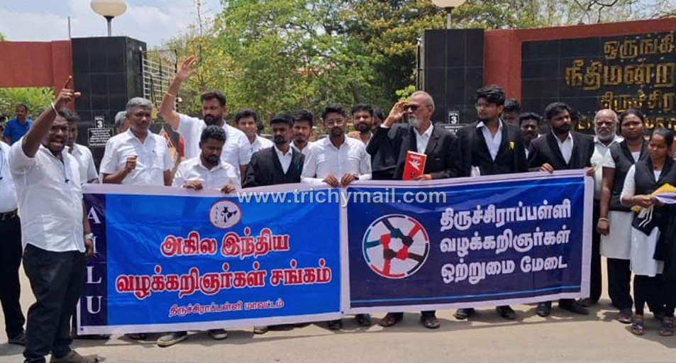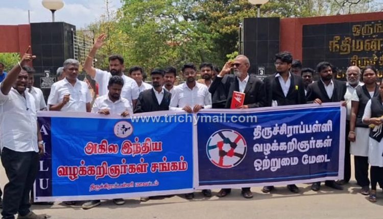 திருச்சி, ஏப்.24 நீதித்துறைக்கு அச்சுறுத்தல் விடுக்கும் துணை ஜனாதிபதி மற்றும் பாஜக எம் பி ஆகியோரை கண்டித்தும் ஜனநாயக பூர்வமான நீதித்துறையை பாதுகாக்க கோரியும் திருச்சி நீதிமன்றம் முன் அகில இந்திய வழக்கறிஞர்கள் சங்கம் மற்றும் தமிழ்நாடு வழக்கறிஞர்கள் ஒற்றுமை மேடை சார்பில் இன்று ஆர்ப்பாட்டம் நடைபெற்றது.