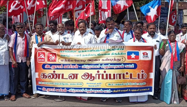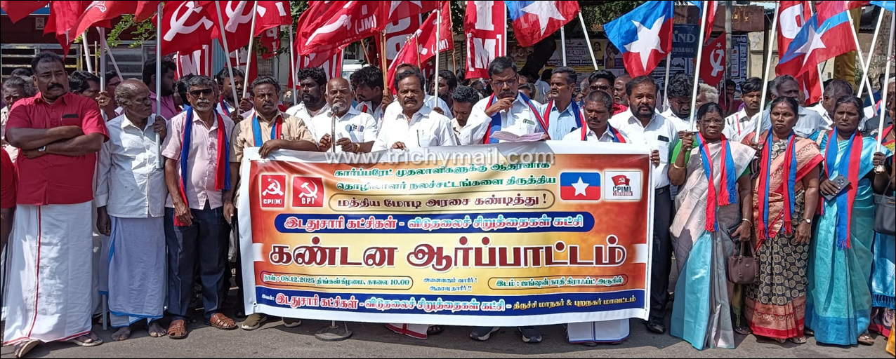 21.11.2025 அன்று மோடி அரசு அறிவித்த லேபர் கோடு திருத்த மசோதாவை திரும்ப பெற வலியுறுத்தி இடதுசாரி கட்சிகள், விடுதலை சிறுத்தை கட்சி திருச்சி மாநகர், புறநகர் மாவட்ட குழுக்கள் சார்பில் திங்களன்று திருச்சி ரயில்வே ஜங்ஷன் எதிரில் கண்டன ஆர்ப்பாட்டம் நடந்தது. ஆர்ப்பாட்டத்திற்கு மார்க்சிஸ்ட் கம்யூனிஸ்ட் கட்சியின் மாநாகர் மாவட்ட செயலாளர் கோ.வி.வெற்றி செல்வம் தலைமை தாங்கினார்.