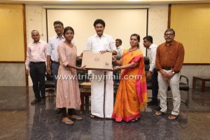 என்.ஐ.டி.யில் தேர்வாகியுள்ள அரசு பள்ளி மாணவர்களுக்கு அமைச்சர் அன்பில் மகேஸ் மடிக்கணினி வழங்கி பாராட்டு