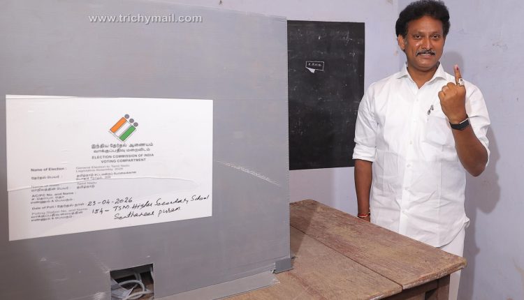 திருவெறும்பூர் தொகுதி வேட்பாளரும் பள்ளிக்கல்வித்துறை அமைச்சருமான அன்பில்மகேஸ் பொய்யாமொழி செந்தண்ணீர்புரம் டி.எஸ்.எம். உயர்நிலைப்பள்ளியில் சுமார் 30 நிமிடம் தன் மனைவியுடன் நீண்ட வரிசையில் காத்திருந்து தனது வாக்கினை செலுத்தினார். பின்னர் செய்தியாளர்கள் அமைச்சர் அன்பில் மகேஸ் கூறுகையில் தொகுதி மக்களுக்கு அளித்த வாக்குறுதிகளை நிறைவேற்றிவிட்டு இந்த தேர்தல் சந்திக்கிறேன். மக்கள் கண்டிப்பாக தி.மு.க.வுக்கு ஆதரவளிப்பார்கள். வாக்குரிமை உள்ள அனைவரும் வாக்குச்சாவடிக்கு சென்று வாக்களிக்க வேண்டும் என்று கேட்டுக் கொண்டார்.