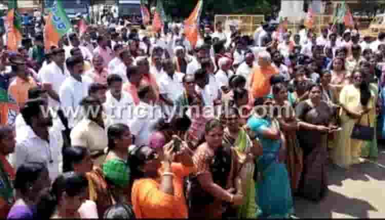 திருச்சி மாவட்ட ஆட்சியர் அலுவலகம் முன்பு திருச்சி மாவட்ட பாஜக சார்பில் தாய் மொழியாம் தமிழுக்கு முடிவுரை எழுதும் திறனற்ற திமுக என்ற தலைப்பில் கண்டன ஆர்ப்பாட்டம் நடைபெற்றது.