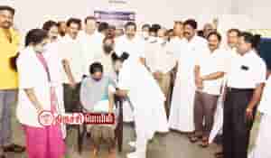அருகில் மாவட்ட ஆட்சித் தலைவர் சிவராசு, மாநகராட்சி ஆணையர் முஜிபூர் ரகுமான், திருச்சி கிழக்கு சட்டமன்ற உறுப்பினர் இனிகோ இருதயராஜ், முன்னாள் சட்ட மன்ற உறுப்பினர் அன்பில் பெரியசாமி, முன்னாள் துணை மேயர் மு.அன்பழகன், மாவட்டப் பிரமுகர் வைரமணி மற்றும் பலர் உள்ளனர்.