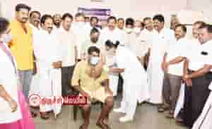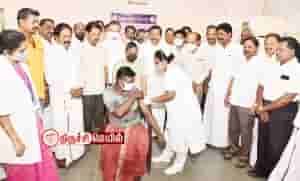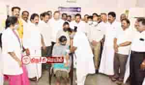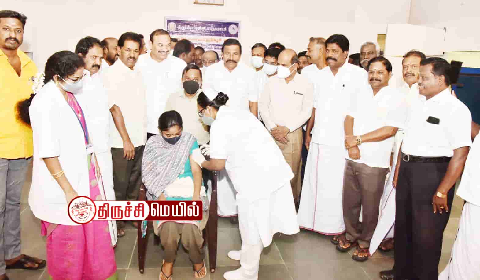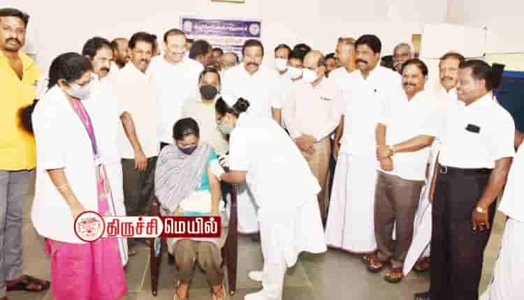 திருச்சி தில்லைநகர் கி.ஆ.பெ.விசுவநாதம் மேல்நிலைப்பள்ளியில் நடைபெற்ற மாபெரும் கொரோனா தடுப்பூசி முகாமை நகராட்சி நிர்வாகத் துறை அமைச்சர்