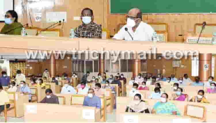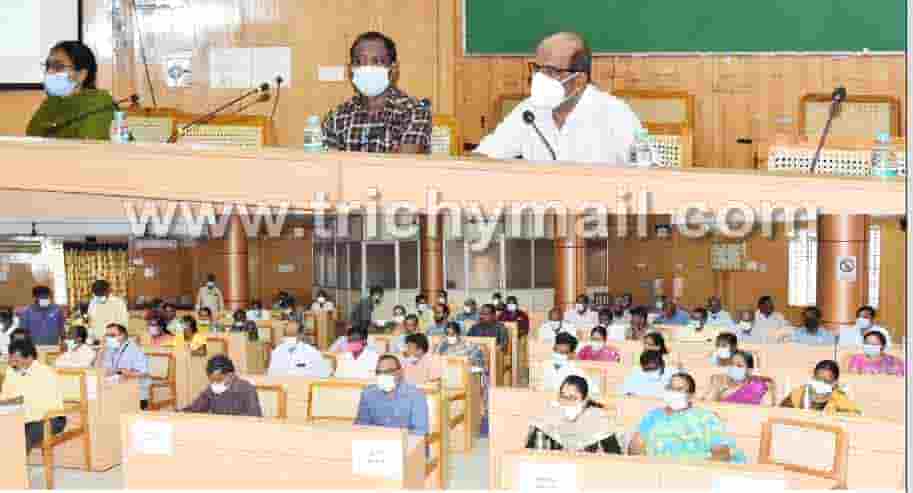 திருச்சி மாவட்ட ஆட்சியரகத்தில் வருவாய்த்துறை அலுவலர்களுக்கான மாதாந்திர கூட்டம் கலெக்டர் சிவராசு தலைமையில் நடைபெற்றது. அருகில் மாவட்ட வருவாய் அலுவலர் பழனிகுமார், மாவட்ட ஆட்சியரின் நேர்முக உதவியாளர் ஜெயப்பிரித்தா உள்பட பலர் உள்ளனர்.