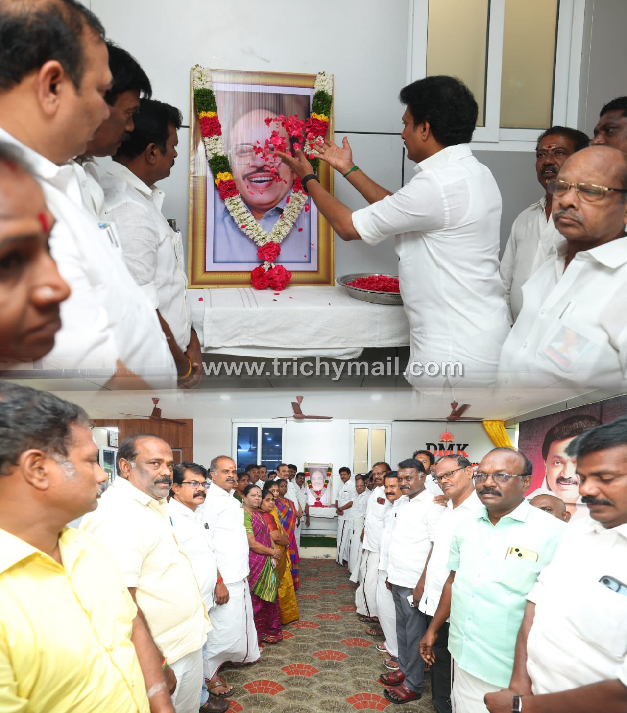 திருச்சி, நவ. 23முன்னாள் ஒன்றிய அமைச்சர் முத்தமிழ் அறிஞர் டாக்டர் கலைஞர் அவர்களின் மனசாட்சியாக விளங்கிய முரசொலி மாறன்  20’வது ஆண்டு நினைவு தினத்தையொட்டி திருச்சி தெற்கு மாவட்டக் கழகச் செயலாளர்  அமைச்சர்  அன்பில் மகேஸ் மாவட்டக் கழக அலுவலகத்தில் அலங்கரித்து வைக்கப்பட்டிருந்த திருவுருவ படத்திற்கு மலர்த்தூவி மரியாதை செலுத்தினார்.