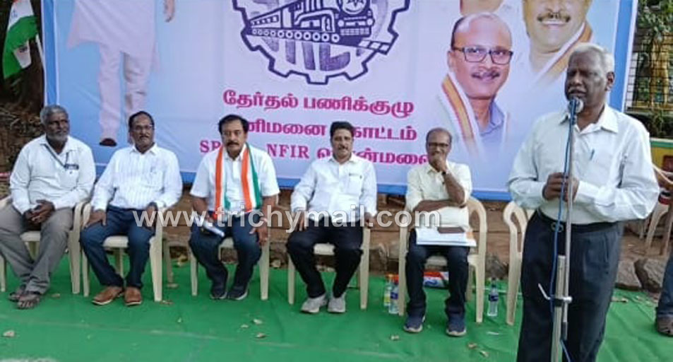 தென்னக ரயில்வே தொழிலாளர் சங்கத்தின் வாயிற் கூட்டம் திருச்சி பொன்மலை ஆர்மெரி கேட் முன்பாக இன்று நடைபெற்றது இந்தக் கூட்டத்திற்கு பொன்மலை கோட்டம் துணை பொதுச்செயலாளர் ரகுபதி தலைமை தாங்கினார். நிர்வாக தலைவர் சூரிய பிரகாஷ் நிர்வாக பொதுச் செயலாளர் சந்திரசேகர் ஆகியோர் முன்னிலை வகித்தனர். இந்த வாயில் கூட்டத்திற்கு தென்னக ரயில்வே தொழிலாளர் சங்கத்தின் பொதுச்செயலாளர் சூரிய பிரகாசம் சிறப்பு அழைப்பாளராக கலந்து கொண்டு புதிய பென்ஷன் திட்டத்திற்கு எதிர்ப்பு தெரிவித்தும் பழைய பென்ஷன் திட்டத்தை வரவேற்றும் மேலும் வருகிற டிசம்பர் 4, 5, 6-ம் தேதிகளில் நடைபெற உள்ள ரயில்வே தொழிற்சங்க தேர்தல் குறித்தும் மத்திய அரசின் தொழிலாளர் விரோத போக்கை கண்டித்து விளக்கி பேசினார். இந்த வாயில் கூட்டத்தில் திமுக ரயில்வே தொழில் சங்கத்தினர் அதிமுக ரயில்வே தொழில் சங்கத்தினர் மற்றும் தென்னக ரயில்வே தொழிற்சங்க நிர்வாகிகள் உறுப்பினர்கள் உள்ளிட்ட ஏராளமானோர் கலந்து கொண்டனர்